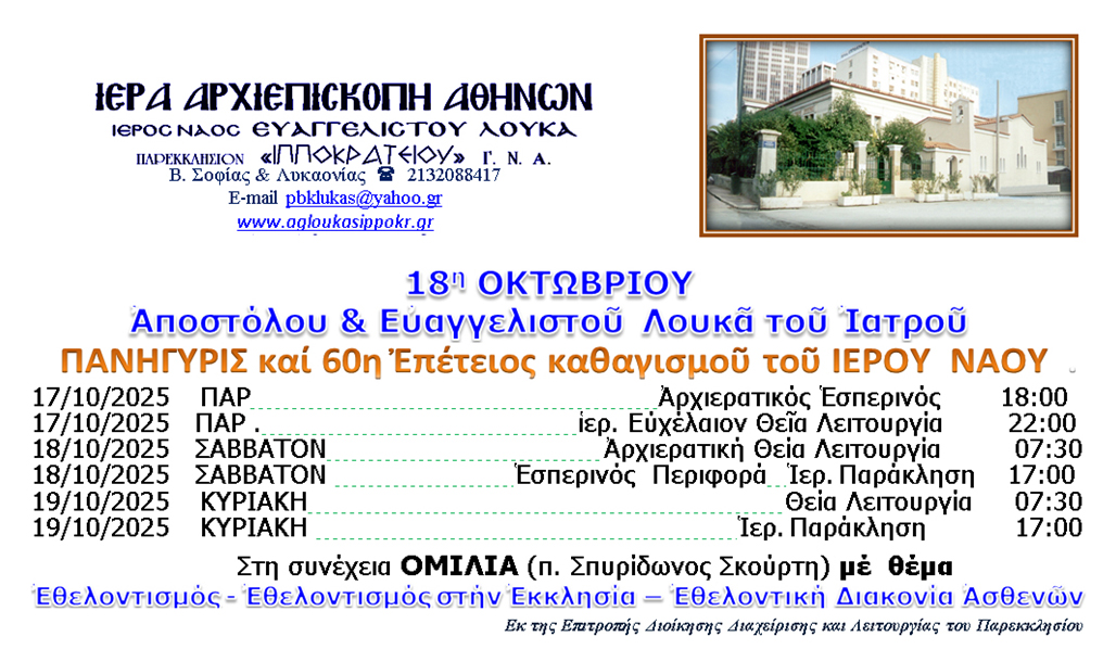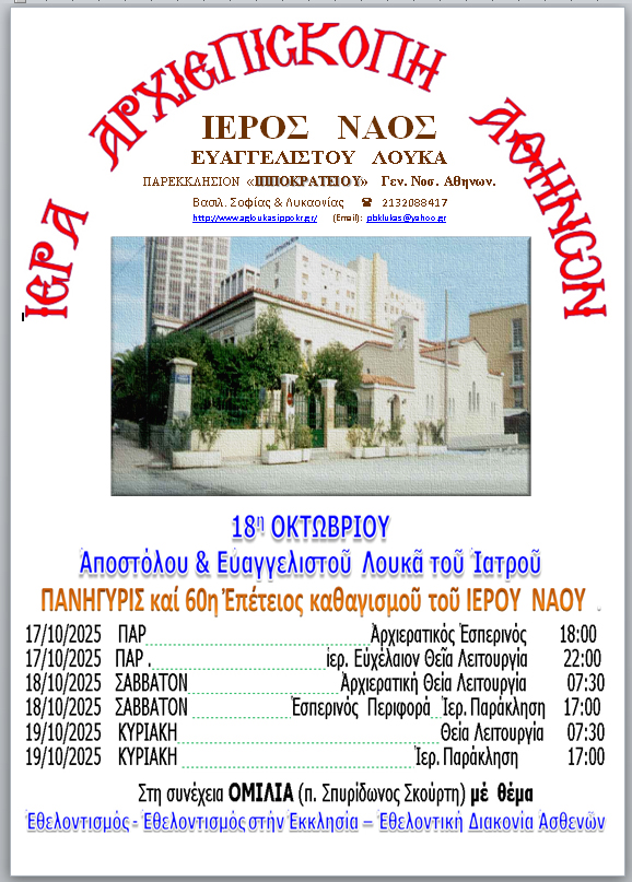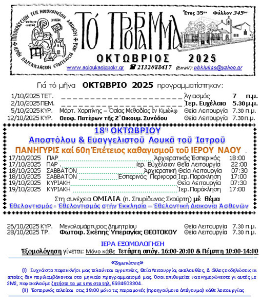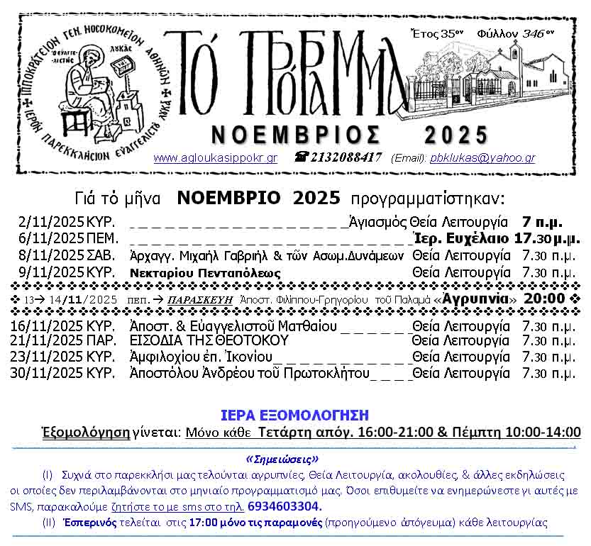 Αναλυτικό μηνιαίο πρόγραμμα (των Ιερών ακολουθιών) εκτυπώνεται και διανέμεται δωρεάν από το Παρεκκλήσι.
